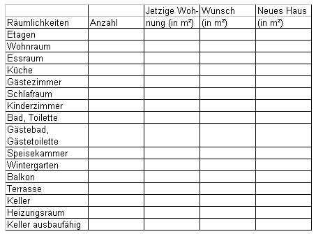 So können Sie Ihren Platzbedarf besser ermitteln. Messen Sie Ihre derzeitige Wohnung aus. Um wieviel größer oder kleiner sollte die neue Wohnung oder können die einzelnen Räume sein? "Mehr" und "größer" ist nicht unbedingt "besser", zumal jeder Quadratmeter -unabhängig vom Kaufpreis- Folgekosten in der Unterhaltung des Gebäudes bedeutet. Die Anforderungen Ihrer Familie an Wohnung und Wohnumfeld verändern sich im Laufe der Zeit. Klären Sie von daher vor dem Hauskauf, inwieweit sich das in Frage kommende Objekt an wechselnde Anforderungen des beruflichen und familiären Lebens anpassen läßt. Eine junge Familie benötigt zuerst ein Haus und ein überschaubares Umfeld für Kinder. Kleinkinder halten sich zumeist in der Nähe der Eltern oder Betreuungspersonen auf, ihnen genügen somit Flure, Küche und Wohnzimmer. Später benötigen Schulkinder, Jugendliche und Heranwachsende mehr und mehr einen eigenen Raum. Ziehen die erwachsenen Kinder aus, ist das Haus vielleicht zu groß für die Bleibenden. Dann müßte es möglich sein, eine zweite separate Wohnung von der Hauptwohnung abzutrennen, um diese zu vermieten.
